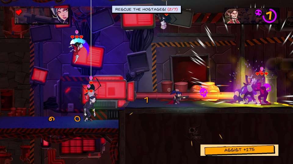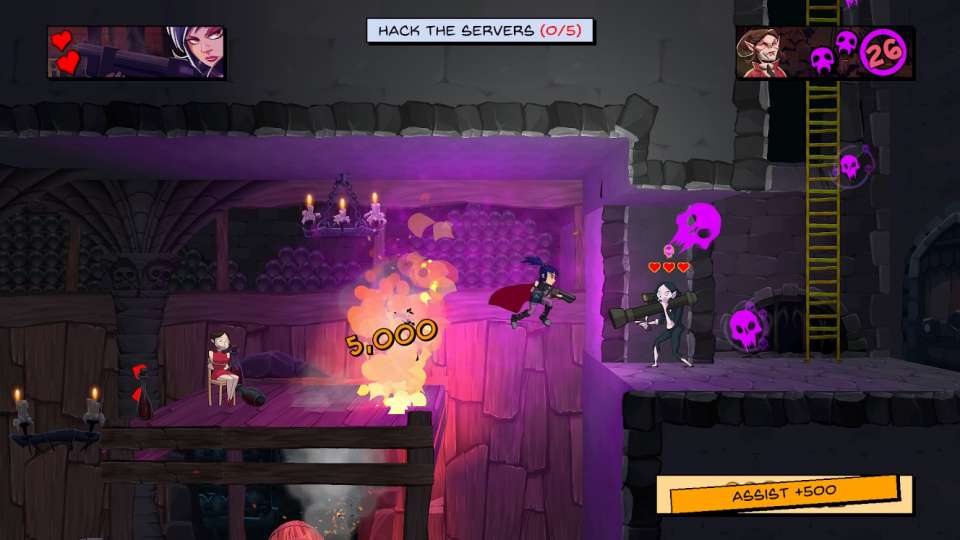 Damsel propose litérallement de semer le chaos avec un style orienté action, plateforme en 2,5D dynamique et exigeant ! Foncez de mission en mission dans la peau de l'agent spécial Damsel, la première et la seule ligne de défense contre les sombres machinations d'une entreprise vampirique. Sauvez des otages, désamorcez des bombes, piratez des serveurs et éliminez des morts-vivants avec précision, vitesse et élégance.