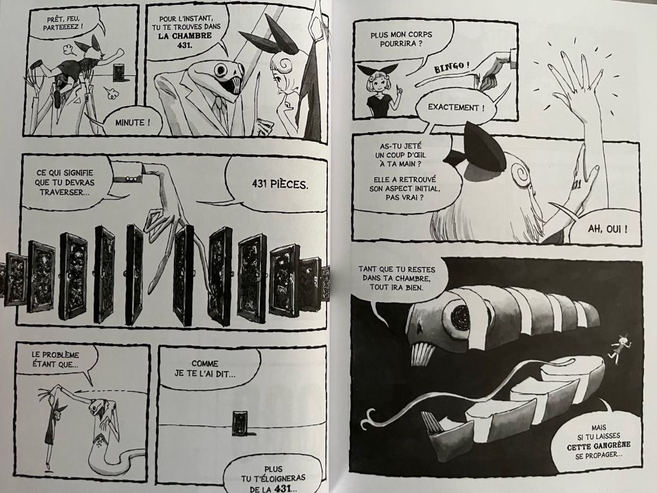 Cette version revisitée d’Alice aux Pays des Merveilles façon horreur, nous invite dans un voyage effrayant à travers les tréfonds de l’âme humaine. La jeune fille va rencontrer des gens que le monde réel a broyés, et qui profitent de l’opportunité de ce manoir où tous les souhaits se réalisent, pour vivre la vie qu’ils ont toujours souhaité, peu importe le sacrifice à faire à la fin. Vengeance, tristesse, remords, sentiments d’infériorité,… se succèdent chambre après chambre, sans jamais décourager Alice d’avancer. Il s’agit de la première œuvre pour les deux auteurs et néanmoins le scénario est aussi maîtrisé que le coup de crayon. Le style est plutôt atypique mais vraiment intéressant.