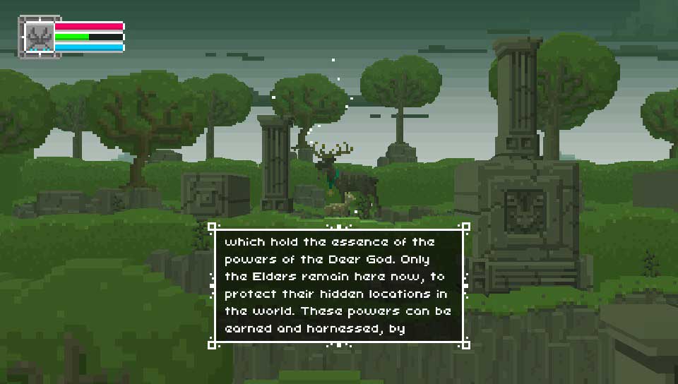 Ce paysage idyllique est un endroit idéal pour la contemplation, mais pas que. Vous irez à la rencontre de nombreux personnages et “ancêtres cerfs” plus ou moins âgés. Comme dans la réalité, les ancêtres ont beaucoup à nous transmettre. C’est ainsi que de vieux cerfs vous apprendront des compétences : Double saut, attaque, démolition, etc…