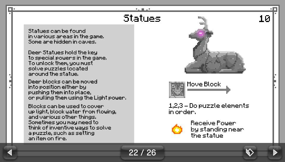 Si hélas, on le regrette, le manuel du jeu est absent en version papier. La bonne surprise est que The Deer God dispose d’un manuel numérique (disponible sur l’écran d’accueil).